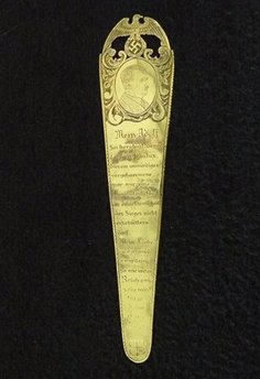 據(jù)稱,這枚金書簽具有特殊的歷史價值,它是希特勒的情人愛娃1943年送給希特勒的禮物,書簽上方雕刻著希特勒的臉,此外還有棲息在納粹十字記號上的鷹圖案,書簽上的題字還提到了1943年1月31日德軍在斯大林格勒戰(zhàn)敗后向前蘇聯(lián)軍隊投降的事件,因此,有人認為愛娃送希特勒這枚書簽是為了安撫希特勒當(dāng)時沮喪的心情。