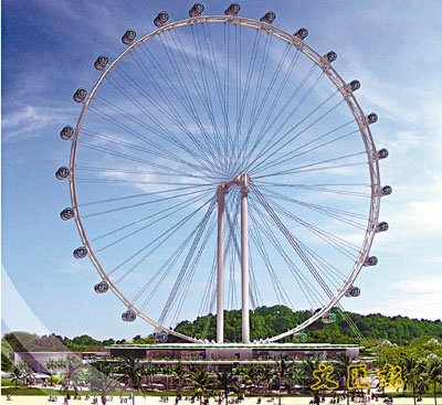 據(jù)香港《文匯報(bào)》報(bào)道,摩天輪設(shè)在新加坡商業(yè)中心區(qū)濱海灣,乘客可在艙內(nèi)以360度飽覽45公里遠(yuǎn)的景色,遠(yuǎn)眺新加坡、馬來(lái)西亞和印度尼西亞的景致。摩天輪一共有28個(gè)觀景艙,每個(gè)觀景艙寬4米、長(zhǎng)7米,室內(nèi)面積特大,有近300平方尺,可容納多達(dá)28位乘客。