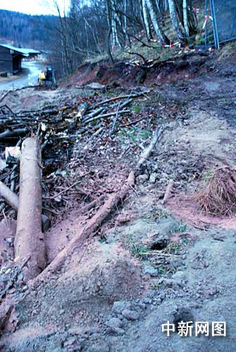冷風(fēng)吹動(dòng)紅白相間的警戒帶,推土機(jī)挖掘出的一條大約3米寬的斜坡路旁邊橫七豎八地倒臥著被伐倒的樹木,路邊和路中間“探寶”留下的的鉆孔清晰可見。斜坡上一塊大約10多平方米的平地上連著至少鉆了4個(gè)洞孔,每個(gè)間隔只有60厘米,四周散落著淡紅色的巖石粉末。