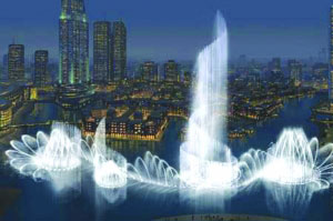 繼興建818米高的“迪拜塔”之后,阿聯(lián)酋地產(chǎn)巨頭艾瑪爾地產(chǎn)公司近日宣布,將在這座世界第一高樓附近打造一座世界最大噴泉。該噴泉高150米,長(zhǎng)275米,相當(dāng)于兩個(gè)足球場(chǎng)長(zhǎng),可以變幻1000種造型,耗資高達(dá)2.18億美元,將于2009年投入使用。一旦竣工,它將成為迪拜市又一地標(biāo)性景觀,預(yù)計(jì)每年將吸引1000萬(wàn)名國(guó)際游客。目前,艾瑪爾地產(chǎn)公司懸賞27225美元,為這座噴泉征集“靚名”。