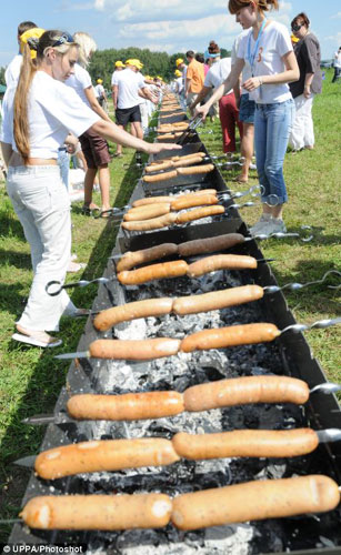 日前,志愿者們在俄羅斯首都莫斯科集體烤肉,創(chuàng)造了世界上最長的燒烤攤的紀錄。