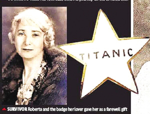 據(jù)悉,當“泰坦尼克號”在1912年4月14日深夜撞上冰山沉沒時,羅伯塔和她的船員戀人遭遇了痛苦的生離死別。那名船員在郵輪即將沉沒時做出了一個無私的舉動:他將自己身上唯一一件救生衣脫了下來,穿到了羅伯塔身上,并將羅伯塔護送上了一艘救生艇。當羅伯塔乘坐救生艇從“泰坦尼克號”船舷邊被放下大海時,那名船員將自己身上一枚白星公司的徽章摘了下來,塞進羅伯塔的手中作為紀念物。