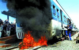 阿根廷電視臺(tái)畫(huà)面上,布宜諾斯艾利斯西郊梅洛站?康囊涣谢疖(chē)冒著黑煙,火焰吞沒(méi)整列火車(chē)。在鄰近梅洛的卡斯特拉爾站,乘客向售票處投擲石塊,站在鐵軌上阻止列車(chē)進(jìn)站。
