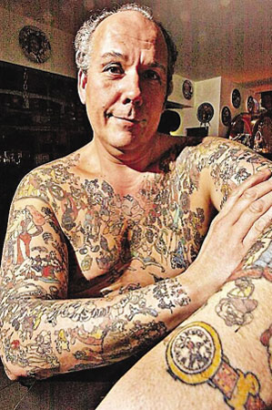 美國賓夕法尼亞州伯利恒市53歲男子喬治·賴格從8歲首次踏入迪斯尼樂園起,就與迪斯尼結(jié)下了不解之緣:他的家被裝飾成“迪斯尼風(fēng)格”,屋中擺滿了26000多件迪斯尼紀(jì)念品。為了表示對(duì)迪斯尼動(dòng)畫片的熱愛,賴格從18歲起就開始在身上文上各種迪斯尼動(dòng)畫主角圖案,他在肚皮上文上了《木偶奇遇記》、在左肩文上了《美女與野獸》、在背部文上了《101斑點(diǎn)狗》……除了臉部、頸部和雙手外,賴格迄今為止在全身總共文滿了1900多個(gè)迪斯尼動(dòng)畫主角圖案!