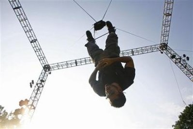 中新網(wǎng)9月23日電 綜合報道,美國魔術(shù)師大衛(wèi)•布萊恩22日開始挑戰(zhàn)年度難度最大的表演:在紐約中央公園距地50英尺倒掛3天。
