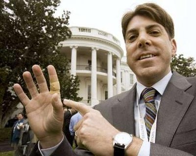 路透社記者德克伸出被美國總統(tǒng)布什的愛犬巴尼咬了一口的食指。