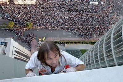 據(jù)悉,阿蘭•羅伯特身高1.65米,以徒手攀爬高樓而聞名世界,他也因此被稱為“蜘蛛人”。動(dòng)漫和電影中的蜘蛛人有蛛絲做道具,而阿蘭•羅伯特比蜘蛛人更牛,因?yàn)樗看闻栏邩峭鈮r(shí),全程靠手,不用任何安全裝備。自1994年至今,他已經(jīng)攀登了世界上七十多座高樓,是世界上攀樓最多的人,去年他成功爬上了420米高的上海金茂大廈。