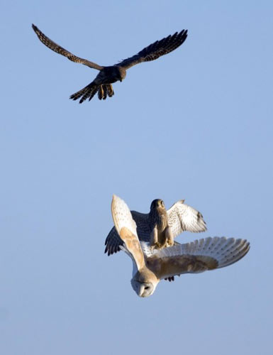 中新網(wǎng)2月6日電 據(jù)英國《每日郵報》5日報道,攝影師近日拍攝到了猛禽“空戰(zhàn)”的精彩照片。照片中顯示,一直谷倉貓頭鷹在白天覓食時遭到兩只茶隼的伏擊。