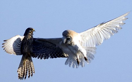 通常情況下,茶隼和貓頭鷹能夠和平相處,兩者并非天敵,而且一個在白天捕食,一個在夜間行動。茶隼攻擊貓頭鷹和貓頭鷹白天進行捕食的現(xiàn)象都不是正,F(xiàn)象。