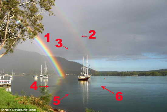 人們幾乎看不清楚第六道彩虹,但是考利博士堅(jiān)持稱(chēng),如果你認(rèn)真看,你就能看到第六道彩虹。他說(shuō):“諾拉的照相機(jī)只拍到了第六道彩虹(圖示6)的部分,它是河面的一次反射,雨滴內(nèi)的兩次反射形成的。由于進(jìn)行了多次反射,其顏色被擴(kuò)散出去,它的外貌僅依稀可見(jiàn)。”(周翔/中國(guó)網(wǎng)3月18日訊)
