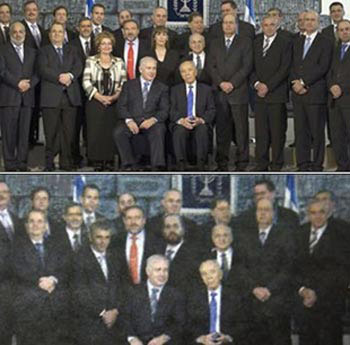 據(jù)克羅地亞“網(wǎng)絡(luò)”4月6日報(bào)道,兩家猶太極端主義報(bào)紙Yated Neeman周報(bào)和Shaa Tova報(bào)將新內(nèi)閣集體合影照中的兩名女性官員——以色列新任文化和體育部長利莫爾·利夫納特女士和移民署署長Sofa Landver女士——經(jīng)過數(shù)碼技術(shù)處理,使她們在合影上“奇怪”地消失了,而站在她們位置上的變成了兩名男士。