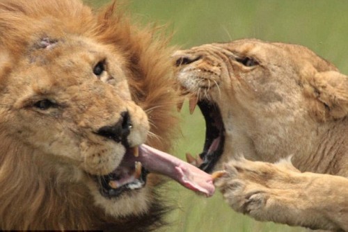 正在博茨瓦納奧卡萬戈三角洲觀察獅群的野生動物攝影師李維坦拍下了這組驚人的畫面。據(jù)他描述,當(dāng)時鄰近一只處在發(fā)情期的母獅朝公獅發(fā)出曖昧的呼喚,公獅的雌性伴侶立即醋意大發(fā),并試圖阻止公獅接近那只發(fā)情的母獅。然而,公獅全然不顧伴侶的警告,尋著母獅的叫聲蹦去,結(jié)果就發(fā)生了照片中驚人的一幕。