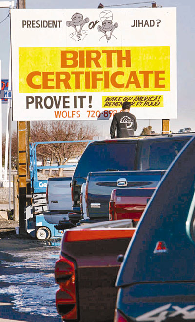 中新網(wǎng)11月22日電 美國(guó)丹佛市一幅二手車車行的巨型廣告海報(bào),可見一個(gè)佩戴穆斯林頭巾,酷似美國(guó)總統(tǒng)奧巴馬的卡通肖像,標(biāo)題寫上:“總統(tǒng)還是圣戰(zhàn)?”。這種“出位”宣傳手法引起極大爭(zhēng)議,左翼團(tuán)體指該廣告涉嫌種族歧視,呼吁消費(fèi)者抵制該車行。