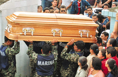 中新網(wǎng)12月24日電 綜合外電報道,墨西哥反毒戰(zhàn)爭引發(fā)血腥報復(fù)。軍警上周擊斃大毒梟萊瓦,一名海軍士兵在戰(zhàn)斗中陣亡,被追認(rèn)為民族英雄,不料22日早上多名殺手闖入其住所,殺死他的母親等5名親屬,不過在23日警方已經(jīng)將4名嫌疑人抓獲歸案。