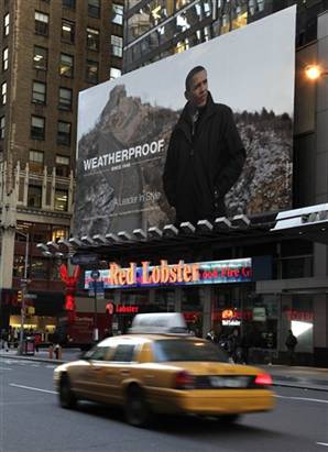 中新網1月7日電 6日,一幅奧巴馬的巨幅照片出現在美國紐約時代廣場,這一次奧巴馬的形象不再完全代表國家總統(tǒng),他成了一個外衣品牌的代言人。