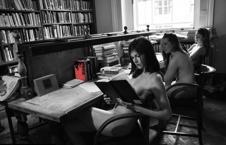 8月號的掛歷上,則是一組女學(xué)生在圖書館中讀書,她們巧用書本遮蓋自己的隱私處。