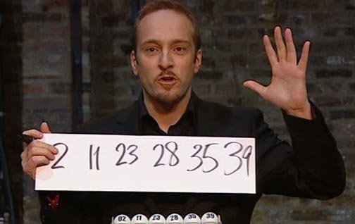 英國電視臺現(xiàn)場直播了當(dāng)期彩票的開獎過程,由機(jī)器隨機(jī)選擇箱子中的球。而在另一個演播室,放置了一臺電視播放開獎過程。這位身處另一演播室的神秘“幻術(shù)師”在結(jié)果出來之前,就背對電視寫下了一組數(shù)字,分別是2、11、23、28、35和39。結(jié)果證實(shí),他所預(yù)測的數(shù)字與中獎結(jié)果完全一致,令人瞠目結(jié)舌。