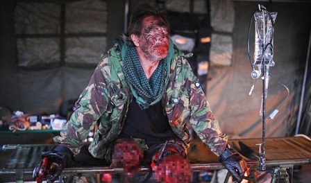 借助涂抹假血等化妝技術(shù),斯威夫特看上去就像是一名剛剛在爆炸中嚴重受傷的士兵。他雙腿齊刷刷地斷掉,斷腿裹著的繃帶滲出血跡,周圍還掛著被炸爛的肉、皮,有的地方骨頭還露了出來。