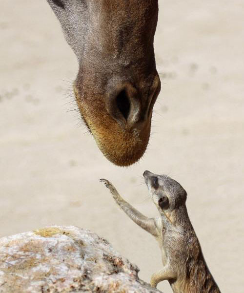 此時,長頸鹿竟低下頭來和狐獴對看,“我從來沒看過這種景象!”阿方索說,原先他沒打算拍攝,因為“我不希望打破這種和諧!辈贿^,當長頸鹿彎身碰到狐獴的頭,看起來就像狐獴向長頸鹿索吻,甚至還“伸手”摸摸長頸鹿。