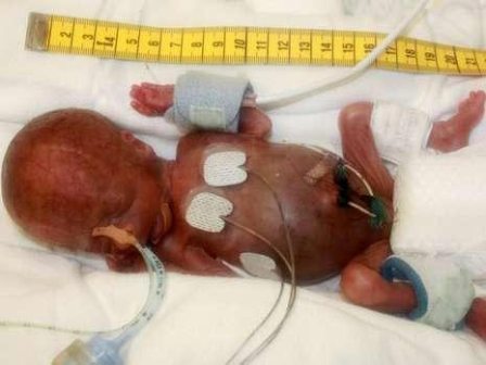 這名男嬰于2009年6月出生,比預(yù)產(chǎn)期提前了15周。當(dāng)時(shí)他在母親體內(nèi)有危險(xiǎn),醫(yī)生立即實(shí)施了剖腹產(chǎn)。出生時(shí)男嬰極其纖弱,大小和一張A4紙差不多,體重只有275克,輕得像一塊黃油。醫(yī)生不得不把他放在保育箱里,但是仍然不能保證其成活。經(jīng)過(guò)6個(gè)月的精心護(hù)理,2009年12月,這名男嬰體重增加到3.7公斤,和一名足月的新生兒差不多大小,順利出院。