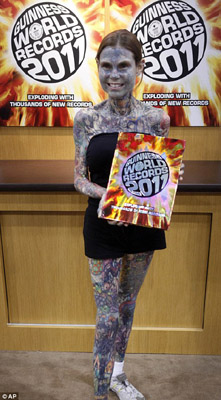 中新網(wǎng)5月27日電 據(jù)英國媒體報道,美國女孩希努斯(Julia Gnuse)全身95%都覆蓋著五顏六色的紋身。她也被吉尼斯世界紀(jì)錄評為世界上紋身最多的女人。5月26日,她出席了紐約圖書博覽會,也展示了自己身上的紋身。