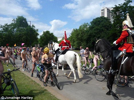他們?cè)谛袕降絺惗睾5鹿珗@時(shí)與這些皇家騎警不期而遇。身著華麗服飾,裝備奢華的士兵們騎著高大的駿馬在這些“一絲不掛”的騎車人中踱步,場(chǎng)面好不尷尬。
