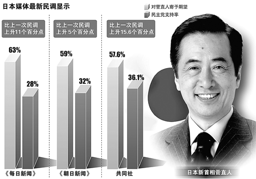 如果說去年9月民主黨實(shí)現(xiàn)政權(quán)更迭是日本政治的歷史性轉(zhuǎn)折,那么今年6月民主黨再次組閣則是擺脫該黨頹勢的重要轉(zhuǎn)折。近日,日本多個(gè)民調(diào)顯示,民主黨的支持率正迅速大幅回升。