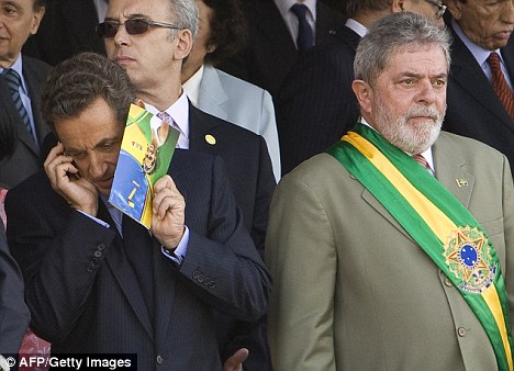 法國總統(tǒng)薩科齊6日至7日對(duì)巴西進(jìn)行國事訪問,并應(yīng)邀出席了巴西獨(dú)立節(jié)的慶祝及閱兵活動(dòng)。閱兵活動(dòng)中,薩科齊偷接電話被媒體逮了個(gè)正著。試圖用宣傳單擋住自己在打電話的舉動(dòng),可謂是“欲蓋彌彰”。