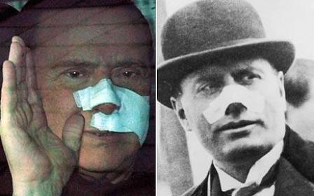 出院時,只見貝氏鼻子和左臉都包著白紗布,有人指出他的這一形象與80多年前,意大利法西斯獨裁頭子墨索里尼遇襲的形象十分相似。據(jù)悉,1926年,一名憤怒的愛爾蘭貴族在一次會議上槍擊了墨索里尼,子彈恰恰擦中了墨索里尼的鼻子。與貝盧斯科尼一樣,墨索里尼當年遇襲時同樣是意大利總理、同樣是臉部受傷,照片顯示二人連包扎傷口的位置都幾乎相同,不禁讓人感嘆歷史奇妙的巧合。