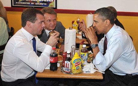 中新網(wǎng)6月25日電 據(jù)外國媒體報道,24日上午的雙邊會議結束后,美國總統(tǒng)奧巴馬帶俄羅斯總統(tǒng)梅德韋杰夫到自己常去的雷氏漢堡店(Ray's Hell Burger),享用漢堡美食。