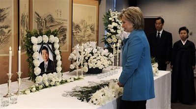 希拉里當(dāng)天上午9時抵達(dá)大使館,在韓國駐美大使韓德洙的帶領(lǐng)下走向盧武鉉的靈堂。在吊唁簿上簽字,向靈堂獻(xiàn)花,并進(jìn)行了默哀。