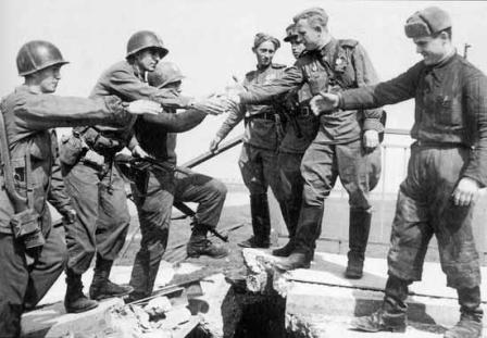 1945年4月25日,一支美軍偵察隊(duì)與一隊(duì)蘇軍在德國(guó)城市托爾高(Torgau)南部易北河畔的一座橋上勝利會(huì)師,一幅美蘇兩軍士兵握手的照片從此傳遍世界,成為反法西斯戰(zhàn)爭(zhēng)歐洲戰(zhàn)場(chǎng)出現(xiàn)勝利曙光,希特勒政權(quán)即將滅亡的最廣為人知的象征之一。