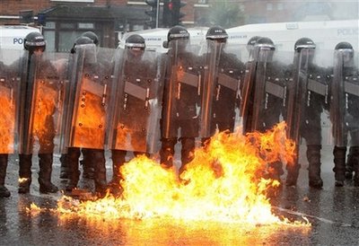 13日晚,在貝爾法斯特參加游行的新教徒向防暴警察投擲汽油彈、焰火和磚塊,警察則以高壓水槍還擊。在雙方的對(duì)峙中,警方至少開(kāi)出一槍?zhuān)?枚燃燒彈被擲向了防暴警察。