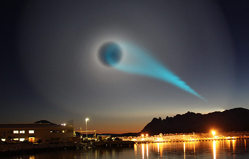 在挪威,神秘螺旋光于9日晨約8時(shí)45分在挪威北部出現(xiàn),綜合目擊者所述,起初只是一道類似北極光的藍(lán)光,從山后射出,在半空停頓后,末端不住旋轉(zhuǎn),愈轉(zhuǎn)愈大,終于變成一圈圈龐大的白色光環(huán),最后一道藍(lán)綠色光束從螺旋中心迸發(fā)而出,直射山后,圖案歷時(shí)10至12分鐘。