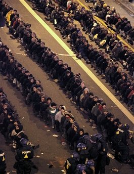 近日來,在哥本哈根舉行的示威活動大部分是和平的,但是在當(dāng)天的集會中,有數(shù)百名身穿黑衣的年輕人在街上投磚頭,砸窗戶,警方對此進行了干預(yù)。防暴警察包圍了鬧事者,要求他們坐在地上,把手放在身后,然后被集體押上警車。