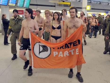 據(jù)德國(guó)《圖片報(bào)》1月10日?qǐng)?bào)道,當(dāng)?shù)貢r(shí)間周日下午,德國(guó)“海盜黨”(一個(gè)宣傳保護(hù)個(gè)人隱私的小黨派)的約15名成員在柏林機(jī)場(chǎng)A航站樓半裸抗議政府引進(jìn)更為嚴(yán)格的機(jī)場(chǎng)身體掃描設(shè)備。