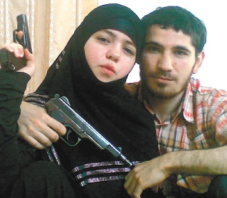 俄警方公布的2張照片中,她和丈夫甜蜜依偎,手里卻分別拿著槍和手榴彈。