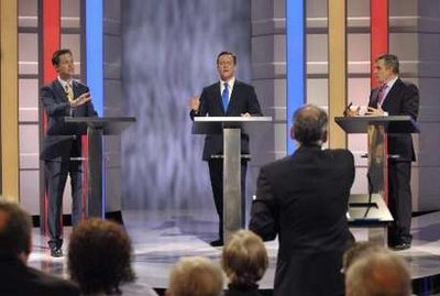 中新網(wǎng)4月16日電 據(jù)法新社報道,英國三大政黨黨首15日舉行英國有史以來首場選舉電視辯論,事前不那么被看好的自由民主黨黨首克萊格爆冷贏得首場辯論,在辯論后的民意調(diào)查當(dāng)中戰(zhàn)勝執(zhí)政黨工黨黨首布朗和在野保守黨黨首卡梅倫。