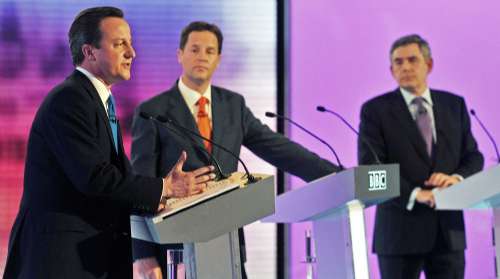 工黨領袖布朗、保守黨領袖卡梅倫和自由民主黨領袖克萊格分別就削減財政赤字、減少稅收、銀行監(jiān)管和英國制造業(yè)等一系列問題交鋒。