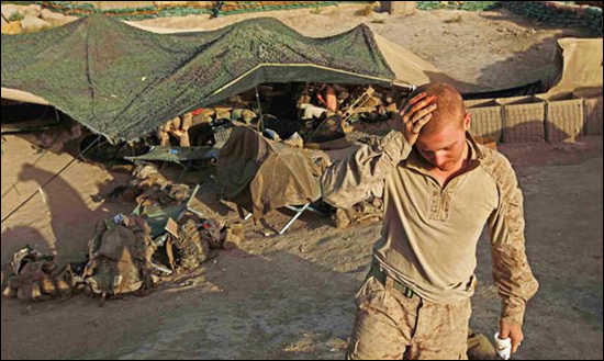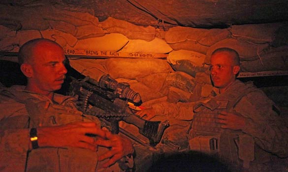 這個觀察哨名為“巖石”,就位于赫爾曼德省哈桑·阿巴德巡邏基地東南部幾百米處,在過去幾個月中,這里一直有2到8名海軍陸戰(zhàn)隊士兵駐扎。這里是一個孤獨暴露的20米高地,2008年夏季被美軍占領(lǐng)。士兵們不僅需要忍受38攝氏度的高溫,還要全天候輪班守衛(wèi),眼睛時刻盯著沙袋之間的射擊孔,消遣就是看雜志和去臨時體育館,每個周日早晨,通常會受到塔利班的輕武器和火箭彈的襲擊。