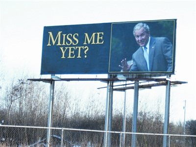 在廣告牌上,右側(cè)是一張小布什的照片,左側(cè)是一句設(shè)計(jì)臺(tái)詞:“想我了嗎?”