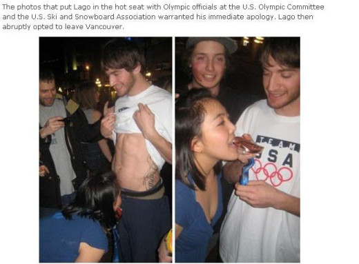 日前,一些關(guān)于拉戈在比賽后慶祝勝利盡情放松的照片在互聯(lián)網(wǎng)上流傳。從照片上看,拉戈與朋友們的慶祝方式極為不雅,他因此被斥為美國(guó)隊(duì)的恥辱。照片中,拉戈在溫哥華市內(nèi)的一處房屋內(nèi),身著美國(guó)隊(duì)訓(xùn)練服,佩戴著剛剛獲得的銅牌,而一名不知名的女子在他的腰部左右的位置親吻拉戈的獎(jiǎng)牌。