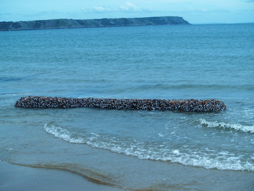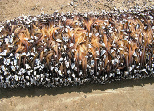度假游客麗貝卡・波特以為自己看見(jiàn)了“一只活生生的大海怪”。她說(shuō):“它有兩米長(zhǎng),像電線桿子那么粗”,“事實(shí)上它們可能是我見(jiàn)過(guò)的最大型的飄浮的狗爪螺(又稱茗荷兒,鵝頸形藤壺)標(biāo)本”。經(jīng)專家驗(yàn)證后,這個(gè)所謂的異星怪物原來(lái)是不計(jì)其數(shù)的狗爪螺。它們?cè)旧钤诤Q笊钐,受壞天氣影響從海里翻涌出?lái),并密密麻麻地附著在一塊木頭上隨波逐流,最終到達(dá)海灘,才成了這副模樣。