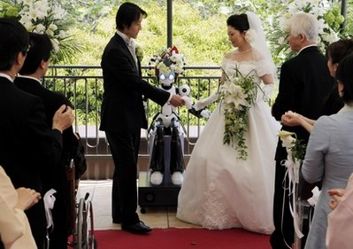 這款高約1.5米的機器人身體主要是白色,頭戴花環(huán),還有兩根塑料辮子。“她”的眼睛可以閃爍,也可以用她細細的嗓音說出“你可以揭開新娘的面紗了”之類的話語,主持起婚禮是有模有樣。