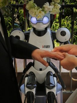 據(jù)報道,16日,一對日本新人在東京日比谷公園(Hibiya Park)一間餐館的開放式屋頂上共結(jié)連理,面對50多名賓客主持婚禮的,不是人類,而是一款名為“I-Fairy”(小精靈)的“美女”機器人。