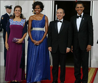 在宴會(huì)上,奧巴馬與卡爾德龍為兩國(guó)友誼互相祝酒。此次國(guó)宴,奧巴馬夫婦再次邀請(qǐng)了他們喜歡的高級(jí)廚師里克•貝雷斯準(zhǔn)備菜肴。