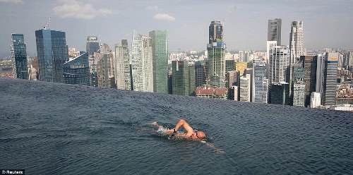 報道稱,建在樓頂的泳池看起來如同水面延伸到地平線一般壯觀。你可以一邊游泳,一邊俯瞰新加坡靚麗的城市風光。從泳池溢出的水會滲入到特別設計的集水區(qū),并通過水泵和水處理系統(tǒng)重新回到泳池中。