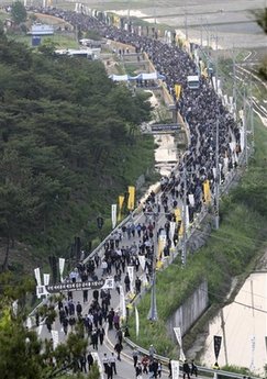 從24日上午至27日下午4時(shí),在四天時(shí)間里共有38萬(wàn)多名吊客在這里就餐。主要由附近村莊的婦女會(huì)員和義勇消防隊(duì)隊(duì)員組成的300多人的志愿團(tuán)從上午11時(shí)到晚10時(shí)準(zhǔn)備出供10萬(wàn)多人食用的飯(以27日為準(zhǔn)),分發(fā)給市民。晚10時(shí)以后提供面包和牛奶、碗面。據(jù)悉,在29日舉行盧武鉉遺體告別儀式后,葬禮委員會(huì)和金海市政府等將分擔(dān)食品費(fèi)用。
