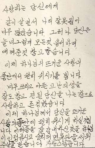 信中稱:“在一起生活的過程中我犯下的錯誤太多了。但你總是寬容地原諒一切過錯,還很愛惜我,真的很感謝你。希望今后能在上帝溫暖的愛的懷抱中安息。你挺過了極其苦難和悲傷的人生,我真的很愛、很尊敬你。你的妻子李姬鎬!