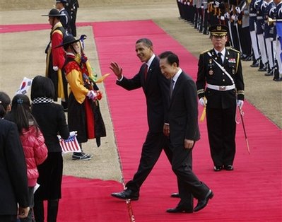 奧巴馬和李明博政府一直對(duì)朝鮮施加金融制裁,并告知朝鮮若放棄核計(jì)劃則可獲得巨額回報(bào)。奧巴馬于上周抵達(dá)亞洲,將于今日晚些時(shí)候回國。